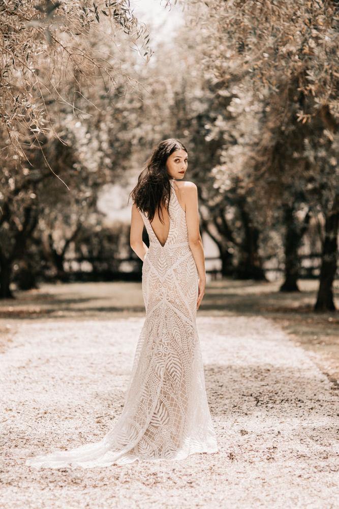 Structured seams featured around the waist, and through the skirt, elongates the figure for a flattering effect. The unique cotton lace is contrasted beautifully with a nude lining to ensure that every detail is visible. A low open back and flared skirt work to accentuate the feminine energy that radiates from this gown.